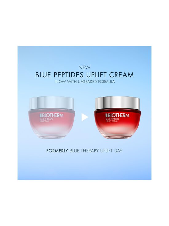 Biotherm Blue Peptides Uplift Cream: Blue Peptides Uplift Cream on Biothermin uuden Blue Peptides -ihonhoitosarjan jäsen, joka paljastaa näkyvästi kiinteämmän ihon ja hehkun salaisuuden. Blue Peptides Uplift Cream on kosteuttava ja kiinteyttävä päivävoide kaikille ihotyypeille, myös herkälle iholle. Biothermin Life Plankton™ -koostumus sisältää uraauurtavia biotieteellisiä innovaatioita ja kollageenipeptidifraktioita, jotka kompensoivat ihon kollageenin menetyksestä johtuvia näkyviä ikääntymisen merkkejä ja auttavat säilyttämään ihon kiinteänä ja näkyvästi kiinteytettynä. Välittömästi kiinteämpi iho, näkyvästi terve hehku ja ajan kuluessa kiinteämpi iho ensimmäisestä 4 tunnista alkaen*.