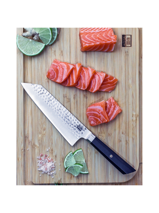 En klassisk japansk Santoku-kockkniv i traditionell Bunka-stil tillverkad av Kotai, som kombinerar de bästa egenskaperna hos både japanska och tyska knivar. Lätt, exakt och knivskarp som en japansk kniv, men rostfri, hållbar och lätt att vässa och underhålla som en tysk kniv.