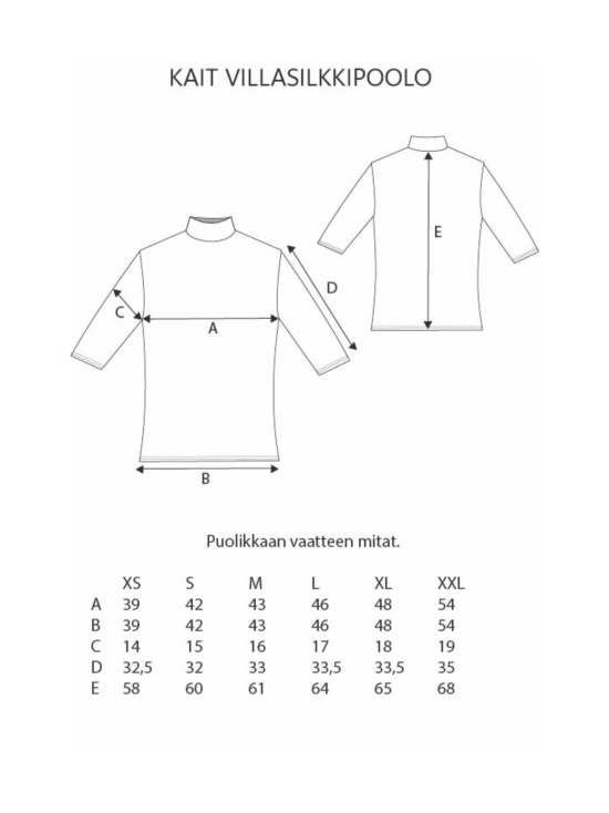 Niinmun Tyylikäs Kait-poolopaita 1/2 hihalla ja kevyellä poolokauluksella. Materiaalina unelman pehmeä merinovilla-silkkineulos, joka tuntuu todella miellyttävältä eikä kutia iholla. Klassinen poolopaita on saanut uuden ilmeen kyynärtaipeeseen ulottuvasta hihasta. Sopii kauniisti leveän housun tai hameen kanssa. Lyhythihainen poolopaita on naisellinen ja minimalistinen vaatekaapin kulmakivi. Kait-poolot ommellaan Suomessa ja neulos on kudottu Suomessa.Lue koko tuotekuvaus Näytä vähemmänMateriaali85% merinovilla 15% silkki Hoito-ohjeetEnsisijaisesti tuuletus. 30C pesu villaohjelmalla. Kuosittele vaate kosteana mittoihinsa. Pese saman väristen kanssa. Suosittelemme käyttämään villapesuainetta ja pyykkietikkaa huuhteluaineen sijaan. PesuohjeetKäsinpesu Pesulämpötila30 °C VäriMUSTA AvainsanatNiinmun, Kait, neulepoolo, merinovilla, silkki, kotimainen, ajaton, klassinen, vastuullinen